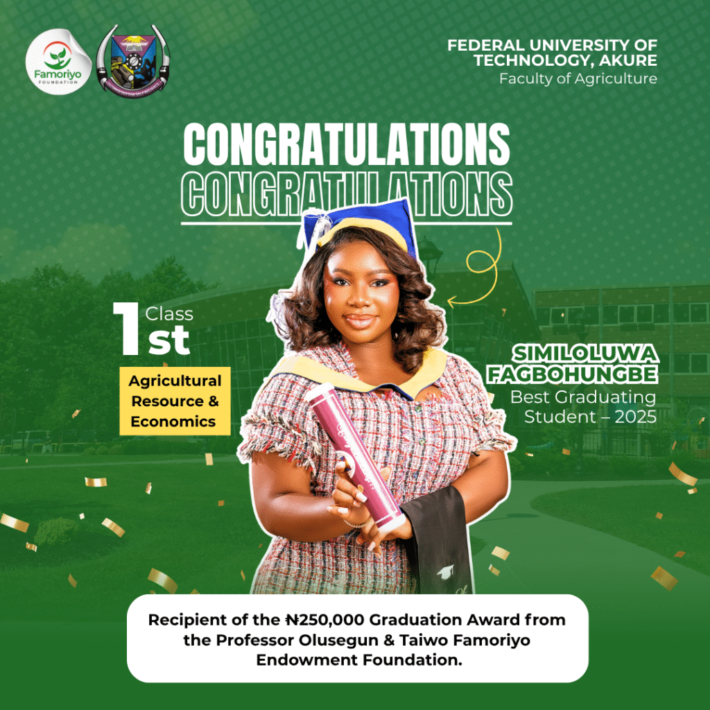 She earned this recognition as the Best Graduating Student from the Faculty of Agriculture, Department of Agricultural Resource and Economics, at the Federal University of Technology, Akure, graduating with a First Class Honours.