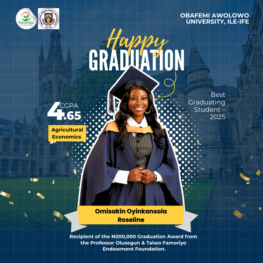 Omisakin Oyinkansola Roseline has been honored with the Graduation Award by the Professor Olusegun and Taiwo Famoriyo Endowment Foundation, receiving a cash prize of ₦200,000, in recognition of her exceptional academic performance.